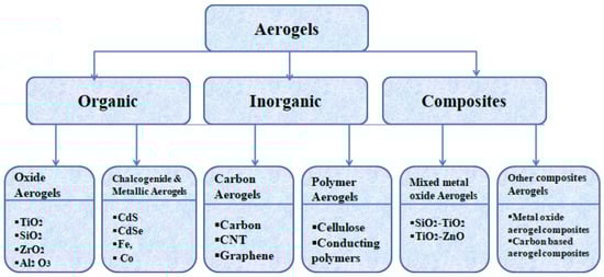 The most researched hybrid aerogels incorporate both inorganic and organic phases, nanoparticles, and cross-linked polymers into the gel matrix. They are then reinforced with fibers and filler to create interpenetrating networks []. These aerogels were acquired in order to enhance their processing as well as their mechanical, physical, and other qualities. The co-pyrolysis of soft fibers such as polyacrylonitrile (PAN) with an RF aerogel matrix yields composite aerogels as carbon fiber-reinforced composites. The aerogels’ toughness, strength, and thermal conductivity are all increased by this technique []. The aerogels’ toughness, strength, and thermal conductivity are all increased by this technique. Examples of this kind of aerogels include cross-linked polymer aerogels, functional nanocomposite aerogels that contain metal or metal oxide nanoparticles in the aerogel matrix with special electrical, catalytic, optical, and magnetic properties, and nanocomposite carbon aerogels containing carbon nanotubes (CNT) [,]. Other examples include carbon aerogels containing nanoparticles of various metals, including Cr, Zr, Mo, Fe, W, Co, Ni, Pd, Pt, Cu, and Ag, as well as silica aerogels containing transition metal oxide nanoparticles, such as NiO [], ZnO [], TiO2 [], Al2O3 [], CuO, and CoFe2O4 [,].