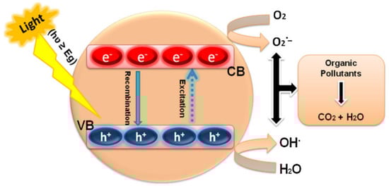 Although directly synthesized aerogel photocatalysts have been extensively studied, only a small number of photocatalysts can be converted into aerogel photocatalysts using the sol-gel or self-assembly processes, severely restricting their practical application []. Immobilizing photocatalysts on the already-prepared aerogel framework to create composite aerogel photocatalysts has thus attracted a lot of attention recently in an effort to streamline the fabrication process and increase the variety of aerogel photocatalysts. In order to create composite aerogel photocatalysts, it should be remembered that practically all photocatalysts can be added to the aerogel framework as shown in Figure 14 []. Additionally, the composite aerogel photocatalyst has the benefits of the aerogel framework as well as the ability to operate as a photocatalyst. When a photocatalyst is exposed to light, photons are absorbed, and excitons are generated. Higher excitons can enhance photocatalytic activity by increasing the probability of electron-hole separation and, thus, the production of ROS. These excitons can then be separated into their constituent electrons and holes, which can participate in redox reactions with adsorbed molecules on the photocatalyst surface. This photocatalysis in the mobile phase facilitates the generation of ROS and increases the efficiency of the process []. Compared to the mobile phase, the photocatalysis is slower in the passivated state, i.e., coated on fabric. However, the easier recovery of active materials and careful design, as well as optimization of the photocatalyst’s properties with minimal secondary pollution, make the proposed strategy closer to practical applications [,].