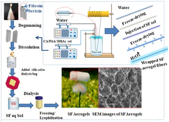 - Yang, H.; Wang, Z.; Liu, Z.; Cheng, H.; Li, C. Continuous, strong, porous silk firoin-based aerogel fibers toward textile thermal insulation. Polymers 2019, 11, 1899. [Google Scholar] [CrossRef]
