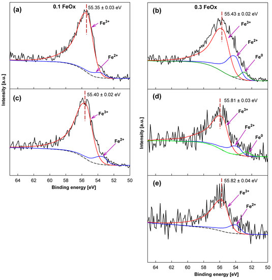 Investigations of the basic elemental composition of the film surfaces performed by XPS spectroscopy (Table 1) exhibit a significant similarity between both types of fresh films (as prepared, before their use in the catalytic tests). A deeper look at the molecular structure, however, revealed quite significant differences. Figure 1a,b shows the core level of the Fe 3p spectrum for both types of films. The spectra were numerically deconvoluted, and the calculated bands were assigned to appropriate oxidation states of Fe [6,34]. On this basis, it can be concluded that while metallic iron (Fe0) is present in the 0.3FeOx film, it is completely absent in the 0.1FeOx film. In turn, the presence of Fe2+ and Fe3+ in both films indicates the possibility of the existence of iron oxides, such as FeO, Fe2O3, and Fe3O4. However, in the case of 0.1FeOx, Fe2O3 (Fe3+) is dominant on the surface, while all three of these oxides may be present on the surface of 0.3FeOx, although the Fe3+/Fe2+ content ratio = 2.02 may indicate Fe3O4 as the main component.