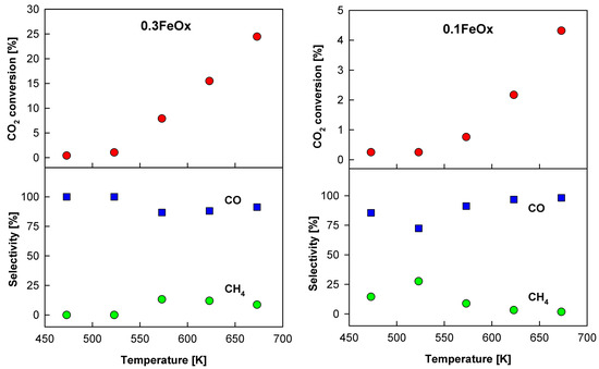 CO2 conversion and selectivity to CO and CH4 as a function of temperature for 0.3FeOx and 0.1FeOx films.