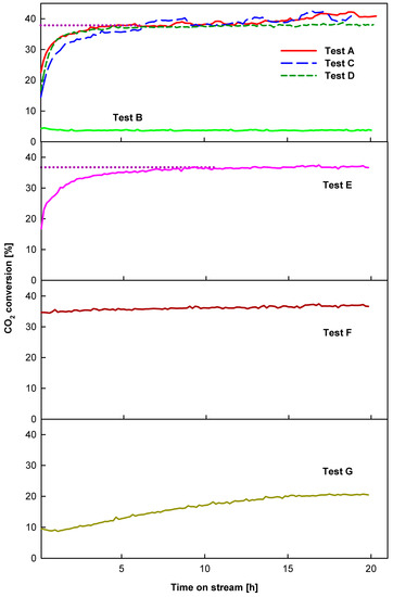Additionally, several tests were conducted to evaluate the performance and repeatability of the catalysts. Following the 20 h time-on-stream run, the system was cooled to room temperature under the flow of the reaction mixture (25 sccm). The catalyst was then held in the air for 12 h before the next catalytic test was restarted. Tests were also carried out in which the catalyst reached a temperature of 673 K, in accordance with the procedure described above, in a flow of helium (25 sccm) or hydrogen (25 sccm) instead of the reaction mixture, and it was maintained in this way for 2 h. The flow of He or H2 was then stopped, and the feed of the reaction mixture was started. After approx. 30 min, the progress of CO2 hydrogenation was monitored over time at 673 K.