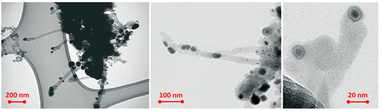 The finding of the formation of a carbon deposit on the 0.3FeOx films in the catalytic process and its moss-like structure shown in the SEM micrographs (Figure 5) suggests the possibility of building this deposit from carbon nanotubes. To delve deeper into the structure of the deposit, studies were carried out using high-resolution transmission electron microscopy (HRTEM).