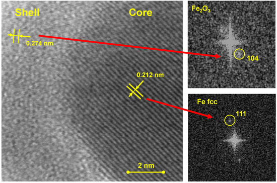 The above conclusions are confirmed by the analysis of the crystallographic structure of the nanoparticles (Figure 8). The clearly visible interplanar spacing in the core of the nanoparticle is 0.211 nm, which is attributed to the plane (111) in the Fe cubic (fcc) structure. In contrast to the core, the shell shows a much more amorphous structure. However, small, ordered areas composed of several planes can be found there. The interplanar spacing determined for them is 0.274 nm, which can be attributed to the plane (104) in the rhombohedral Fe2O3, thus the previously suggested shell structure.