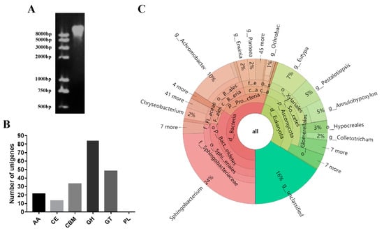 In our previous study, T. fuciformis with its companion strains showed a stronger ability to secrete xylanase than other edible fungi. However, the majority of the microbiota have not yet been isolated and identified, which resulting in the difficulty of identifying these xlyanase genes. Herein, the metagenomic sequencing method was used to search the potential xylanase enzymes in the microbiota of T. fuciformis and its companion strains. The metagenomics DNA was extracted from the mycelium of T. fuciformis with its companion strains by the CTAB method, and the extracted DNA quality was assessed by agarose gel electrophoresis. As shown in Figure 1A, the extracted DNA band was clear and bright, with a size of more than 8000 bp, and no tailing could be observed, suggesting that the metagenomic DNA quality satisfied the sequencing demand. The raw data of metagenomics sequencing generated 62,890,030 reads, which were treated via assembly, CDS prediction, and redundancy elimination. The sum of the unigenes with full open reading frames reached 50,904, which occupied 72.17% of the total unigenes and exhibited good fitness. The taxonomic profile of the microbiota, as deduced from the raw data, is visualized in Figure 1C. The results revealed that the microbiota of T. fuciformis with its companion strains contained 55% prokaryotes, 29% eukaryota, and 16% unclassified species, respectively. Among the prokaryotic microorganisms, Sphingobacterium thalpophilum and Achromobacter sp. were the dominant bacteria, with the fractions of 19% and 9%, respectively, while the fungi of Eutypa lata, Pestalotiopsis lata, and Annulohypoxylon stygium as the main species occupied 7%, 5%, and 5% of the eukaryotic microorganisms, respectively. Furthermore, the obtained unigenes underwent BLASTp alignment with protein sequence from the CAZy database, which resulted in 199 unigenes annotated and classified according to enzyme function (Figure 1B). A total of 84 unigenes among the 199 annotated unigenes were predicted as glycoside hydrolase (GH) and exhibited the largest proportion of CAZymes, with 42.2%, demonstrating that a large amount of GH enzymes might be secreted by T. fuciformis with its companion strains.