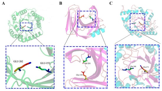 To obtain the exact sequence information of xylanase ORFs, the total RNA extraction of the microbiota was performed and used as the template with which to generate the cDNA via the RT-PCR method. Three genes encoding the xylanase candidates of AsXyn1, AsXyn2, and SsXyn were PCR-amplified using the cDNA as the template by the corresponding primers designed according to their unigene sequences. The sequencing results showed that the AsXyn1 gene had a size of 984 bp and encoded 327 amino acids, which was smaller than the size of the AsXyn1 gene (1110 bp) from genomic DNA. Sequence alignment indicated that the ORF of AsXyn1 gene from genomic DNA contained 2 introns (Table S1), while the genes of AsXyn2 and SsXyn had sizes of 651 bp and 1149 bp and encoded 216 and 382 amino acids, respectively, which was consistent with their unigene sequences (Table S1). Furthermore, the structures of three xylanase candidates were predicted by the SWISS-MODEL web server with the best matching templates of xylanase structures (PDB ID: 1K6A for AsXyn1, 3WP3 for AsXyn2, and 4K68 for SsXyn), which were used to confirm their potential functions. As shown in Figure 2A,C, the overall structures of AsXyn1 and SsXyn fit the typical (β/α)8-barrel skeleton, and two conserved residues of Glu155 and Glu262 for AsXyn1 (Glu166 and Glu271 for SsXyn) could be observed in the active pocket as acid/base catalytic residues. The shape of the overall AsXyn2 structure appeared as a “right hand” composed of β-sheets and α-helix, and the β-sheets formed the “palm” and “fingers”, with an angle of nearly 90 degrees. Two active residues of Glu110 and Glu201 as general acid/base catalytic sites were located in this catalytic center region (Figure 2B). The observed information represented the typical characteristics of GH10 family xylanase for AsXyn1 and SsXyn and GH11 family xylanase for AsXyn2, suggesting that the three xylanase candidates had potential xylanase activity [,].
