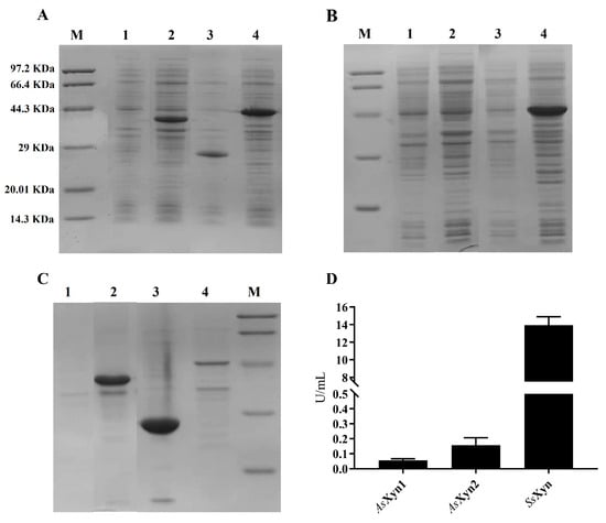 Analysis of expression level and solubility for recombinant enzymes in E. coli. (A) Whole-cell lysate; (B) cell lysate supernatant; (C) cell lysate precipitation; (D) crude enzyme activity (Lane M: Protein Marker; Lane 1: E. coli BL21 (DE3)/pET28a; Lane 2: E. coli BL21 (DE3)/pET28a-AsXyn1; Lane 3, E. coli BL21 (DE3)/pET28a-AsXyn2; Lane 4, E. coli BL21 (DE3)/pET28a-SsXyn).