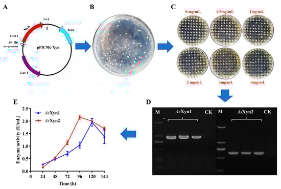 Heterologous expression of AsXyn1 and AsXyn2 in P. pastoris. (A) Construction of recombinant plasmid; (B) preliminary screening; (C) multi-copy transformant selection; (D): colony PCR verification; (E): activity assays of the supernatants by recombinant P. pastoris.