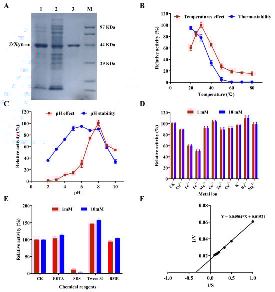 The recombinant enzyme of SsXyn, with a 6×His tag in E. coli after sonication, was purified by Ni-Sepharose Histrap HP column and then characterized for its enzymatic properties. The purified SsXyn enzyme was analyzed by SDS-PAGE, and a clear band with the size of 43.5 kDa can be observed in Figure 5A, indicating that a pure enzyme was obtained. Furthermore, the effects of temperature and pH on the activity of purified SsXyn enzyme were determined. The results showed that the xylanase activity could be increased with an increase in temperature from 20 °C to 30 °C, and a sharp drop appeared at over 30 °C. A maximum specific activity of 33.1 U/mg could be obtained at 30 °C (Figure 5B). Under the optimum temperature, the SsXyn enzyme exhibited the highest specific activity of 62.5 U/mg at pH 8.0, and more than 50% of the activity was retained between pH 7.0 and pH 10.0 (Figure 5C). The thermostability analysis indicated that the SsXyn enzyme possessed better activity at a low temperature (Figure 5B). Moreover, the excellent stability of SsXyn at pH values from 5.0 to 8.0 could be observed. These results demonstrated that the SsXyn enzyme was suitable for use at room temperature with a relatively broad pH range []. Among all the tested ions, Co2+ and Ba2+ were able to improve the enzyme activity of SsXyn by 4% and 10%, respectively. However, obvious inhibition, with an activity decrease of over 40%, could be observed by the ions of Fe2+ and Fe3+ (Figure 5D). Furthermore, some chemical reagents also affected the enzyme activity of SsXyn. As shown in Figure 5E, Tween 80 with 10 mM supplemented in the reaction solution efficiently improved its activity, leading to a 50% increase. Kinetics analysis of the SsXyn enzyme was performed with different concentrations of beechwood xylan at the optimum pH and room temperature, and the results indicated that the estimated values of Km and Vmax were 2.9 mg/mL and 65.8 U/mg according to SsXyn, respectively (Figure 5F).