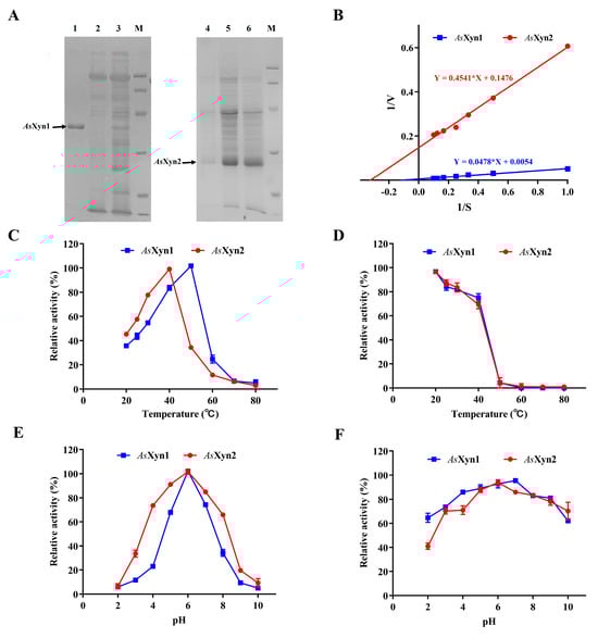 Characterization of the recombinant AsXyn1 and AsXyn2 enzymes by P. pastoris. (A) Enzyme purification; (B) double reciprocal diagram of recombinant AsXyn1 and AsXyn2 xylanases; (C) temperature effects; (D) thermostability; (E) pH effects; (F) pH stability.