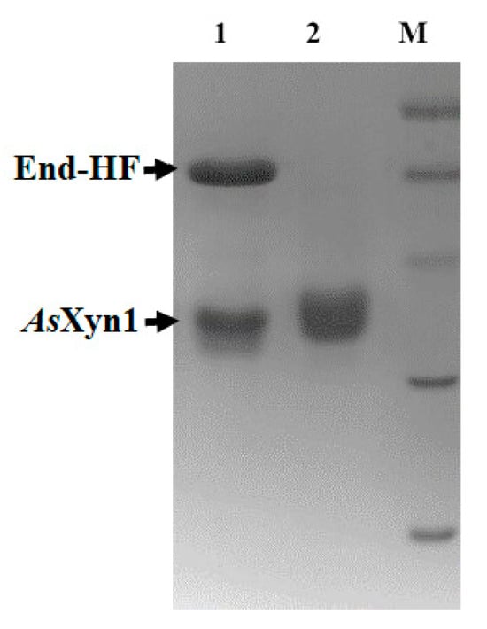 Deglycosylation of the recombinant AsXyn1 enzyme by End-HF enzyme. Lane M: protein marker; Lane 1: deglycosylation of AsXyn1; Lane 2: AsXyn1 as control.