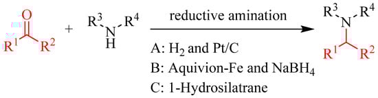 - Varjosaari, S.E.; Skrypai, V.; Suating, P.; Hurley, J.J.M.; De Lio, A.M.; Gilbert, T.M.; Adler, M.J. Simple Metal-Free Direct Reductive Amination Using Hydrosilatrane to Form Secondary and Tertiary Amines. Adv. Synth. Catal. 2017, 359, 1872–1878. [Google Scholar] [CrossRef]