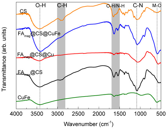 The band at 580 cm−1 in FTIR spectra, usually assigned to metal–oxygen stretching vibrations [42,43,44], was only presented in FAmag@CS@Cu and FAmag@CS@CuFe samples. This agrees with XRF results (Table 1) and corroborates the success of the preparation of the multicomponent FAmag@CS@Cu and FAmag@CS@CuFe samples.