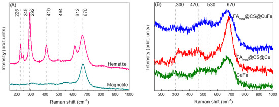 The Raman spectra of the CuFe nanoparticles (Figure 2B) show four Raman active modes at 670 (A1g), 530 (F2g), 470 (T2g) and 300 (E1g) cm−1 and the position of the bands in agreement with the literature data [46,47,48]. The band at 670 cm−1 is usually attributed to the local lattice effect in the tetrahedral sub-lattice, and the band at 470 cm−1 is typically related to local lattice in the octahedral sublattice [47,48]. However, in the Raman spectrum of the tri-component sample (FAmag@CS@CuFe), these bands are overlapped with characteristic bands of iron oxides (from FAmag), which confirm the presence of CuFe nanoparticles in the composite material. The Cu–O modes at ~600 cm−1 and ~300 cm−1 in the Raman spectrum of FAmag@CS@Cu are expected, but they are overlapped by higher intensity bands of iron oxides present in FAmag.