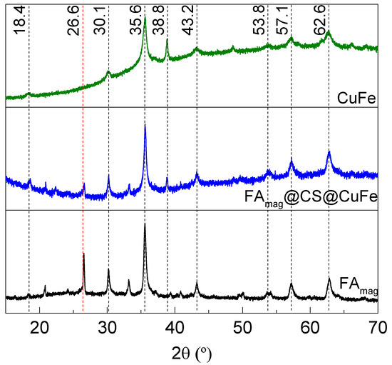 The XRD diffractograms of FAmag, FAmag@CS, FAmag@CS@CuFe and CuFe NP samples are presented in Figure 4. The CuFe nanoparticles show diffraction lines at 18.4°, 30.1°, 35.6°, 38.8°, 43.2°, 53.8°, 57.1°, and 62.6°, corresponding to the tetragonal structure of the copper ferrite [49,50]. The XRD pattern of FAmag confirms the presence of SiO2 (quartz) with a diffraction line localized at 26.6° and iron oxides with diffraction peaks at 2θ = 18.2°, 30.2°, 35.6°, 43.2°, 53.8°, 57.1° and 62.8°, corresponding to the spinel structure of Fe2O3 or Fe3O4. In the FAmag@CS@CuFe composite, the diffraction peaks of CuFe were detected along with a characteristic diffraction peak of FAmag at around 26.6° (2θ), corresponding to quartz, indicating the successful preparation of the material.