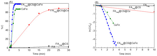 Catalytic reduction process for 4-NPh with CuFe nanoparticles, FAmag, and two- and three-component composites: (A) kinetic plot; (B) linear fit between ln (C/C0) of 4-NPh and time.