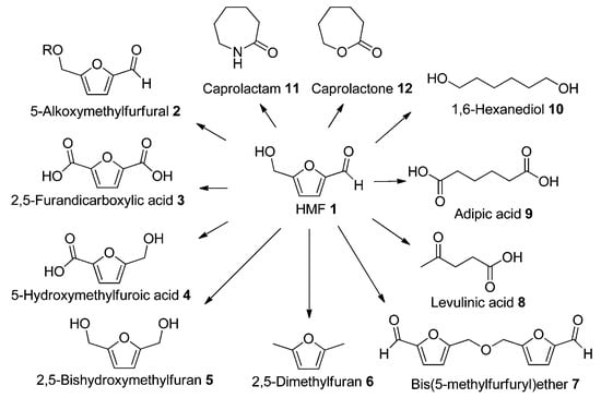 - Portillo Perez, G.; Mukherjee, A.; Dumont, M.-J. Insights into HMF catalysis. J. Ind. Eng. Chem. 2019, 70, 1–34. [Google Scholar] [CrossRef]