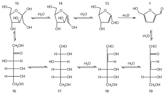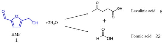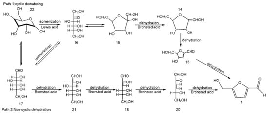 HMF was first isolated from the decomposition of fructose oxalic acid in an aqueous solution. It was not until the middle of the twentieth century that the reaction mechanism of fructose-catalysed dehydration for the preparation of HMF was proposed, and until now, the dehydration mechanism was inconclusive. There are two possible mechanisms, as shown in Figure 2. In the first, fructose removes one molecule of water to form an allylic structural compound, and then removes two molecules of water to form HMF. In the second, fructose molecules remove two molecules of water in the form of a straight chain and then one molecule of water to form a ring-shaped HMF [].