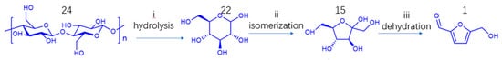 Inulin is an indigestible oligosaccharide, a biopolymer composed of fructose and a small amount of glucose with a degree of polymerisation between 2 and 70, which is mainly found in plants such as inulin tubers and chicory roots []. Raw chicory root can be used for direct conversion to HMF due to its high inulin content (70–75% by dry weight). In particular, about 80–90% of the total carbohydrate content of chicory root consists of inulin-type fructans, and these fractions can be used for the synthesis of HMF []. Inulin is first hydrolysed to fructose, and fructose is then dehydrated to produce HMF, both of which can be catalysed by an acid catalyst so that HMF can be produced using a one-pot method, reducing the loss of intermediate steps []. Therefore, inulin-rich plant materials can be used as an excellent biofeedstock for the production of HMF [].