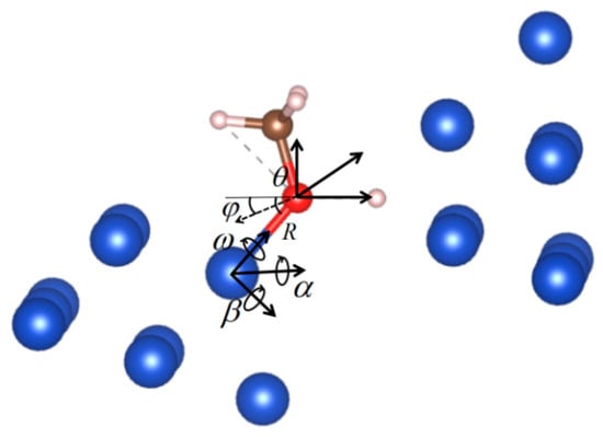 The six variables regarding the Cu-O bond for the corresponding motif: R indicates the length of the bond; θ and ϕ indicate the bond orientation relative to the reactant molecule; α and β indicate the bond orientation relative to the motif; and ω indicates the angle between the reactant and the motif around the bond. In this specific case, θ is defined in the plane defined by the C-O bond and the O-H bond and α refers to the rotation around an axis perpendicular to that plane. Another similar set of six variables can be found for the H-Cu bond for the other motif.