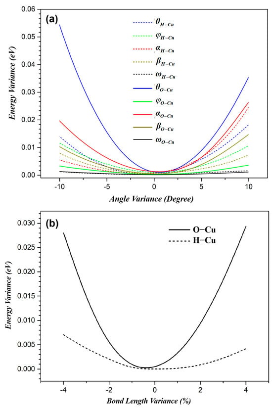 The energy variance in TS with bond orientation (a) and bond length (b). The variance is obtained by fixing the reactant molecule in space while adjusting the angles or the bond lengths as indicated in Figure 5.