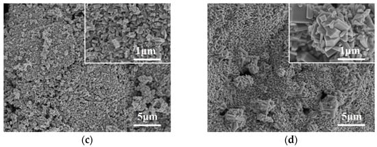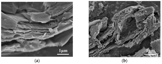 Using emission scanning electron microscopy (SEM) to characterize the micro-morphology of the samples, the results are shown in Figure 1. Figure 1a,b show the MXene carriers with different morphologies, which are multilayered Ti3CN versus monolayer Ti3CN, respectively. Figure 1a shows the un-sonicated multilayered Ti3CN, the mTCN is in the form of a layered block structure, which is in accordance with the “accordion-like” morphology of MXene, attributed to the removal of Al from the blocky Ti3AlCN MAX phase precursor. Figure 1b demonstrates the microscopic morphology of single/few layers of Ti3CN separated by differential centrifugation after ultrasonic layering treatment; compared with multilayered Ti3CN, there is a clear separation between the layers of dTCN, which shows a single and few layers of lamellar structure. This is due to the fact that the bulk structure of multilayer Ti3CN is disrupted during the ultrasonication process, and the layers connected by van der Waals forces are gradually separated from each other. Meanwhile, during the subsequent separation of single/few-layer MXene using differential centrifugation, water molecules as well as residual Li+ would further intercalate the MXene, resulting in further expansion of the interlayer distance [22]. The ultrasonically treated MXene has a sub-micron transverse size [23,24] and the width is concentrated between 200–500 nm [24]. Therefore, dTCN has smaller size, fewer layers, and larger interlayer distance than mTCN.