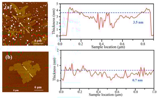 Representative AFM images and the corresponding height profiles of the yellow dotted line: (a) dTCN; and (b) mTCN.