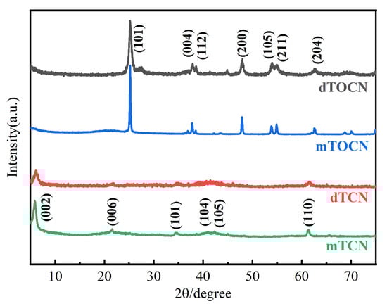 XRD spectra of dTOCN, mTOCN, dTCN, and mTOCN.