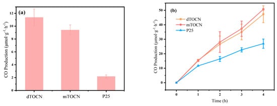 The catalytic testing of the dTOC, mTOCN, and P25 in photothermal synergistic catalytic CO2 reduction. One can see that the main reduction products was CO: (a) the Photothermal synergistic catalytic activity of dTOC, mTOCN, and P25; and (b) the rate of product formation over time.