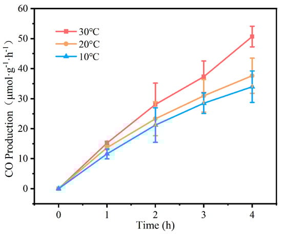 The internal temperature of the catalytic reactor was adjusted by changing the circulating cooling water temperature outside the reactor, and the cumulative precipitation rates of CO2 reduction products of dTOCN photothermal catalytic CO reduction over time under the conditions of 10 °C, 20 °C, and 30 °C were measured, and the results were shown in Figure 6, which showed the precipitation rate of the target products of CO was positively correlated with the reaction temperature, and the thermal energy played a promotional role for the catalytic activity.