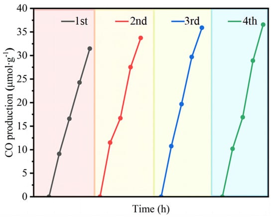 Figure 5 shows the average CO yield of dTOCN under different catalytic conditions within 4 h. The thermal energy provided by IR light alone is not enough to make the reaction cross the activation energy barrier, and the reduction product CO could not be detected in the reactor. The light energy provided by UV-Visible light excites the photogenerated carriers inside the heterojunction and the CO2 is activated by the electrons migrating to the surface of the catalyst, and the reduction product CO can be detected in the reactor with an average precipitation rate of 7.51 μmol·g−1·h−1. Whereas, under the full-spectrum illumination, the UV-Visible waves generate excitation photogenerated carriers to produce photochemistry, and the Visible-infrared part excites thermal energy to produce photothermal effect, and the CO precipitation rate increases to 11.15 μmol·g−1·h−1 under the synergistic effect of the two, and the catalytic activity is greatly improved [1]. It can be seen for the Ti3CN/TiO2 heterojunction, photothermal catalysis is not a simple superposition of photocatalysis and thermal catalysis, and there is a strong synergistic effect between light and heat [27]. On the one hand, UV-Visible illumination excites the carriers of the catalysts, and the transport of carriers facilitates CO2 activation, and on the other hand, the Visible-infrared portion provides the thermal energy for the reaction system, and the thermal energy, in the meantime of degrading the inverse activation energy, further promotes the separation of carriers, which leads to a significant improvement of the catalytic activity [27]. The thermal energy further promotes the separation of carriers while reducing the activation energy, thus realizing the photothermal synergistic and efficient reduction of CO2 in the full spectrum.