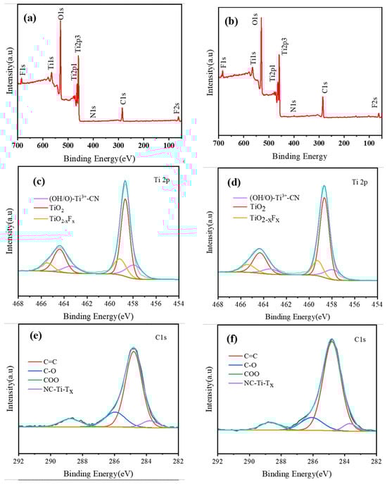 X-ray photoelectron spectroscopy (XPS) analysis was performed to elucidate the chemical elemental composition of the prepared sample surfaces and the bonding state of each element. All binding energies were calibrated by the C1s peak located at 284.8 eV, which belonged to the indefinite carbon (C-C). The full XPS spectra of mTOCN and dTOCN are shown in Figure 8, each vibrational peak in the spectra is labeled, from which it can be seen the heterogeneity contains the elements of C, N, O, Ti, and F. The element of F is derived from the surface end-groups -F on the surface of the Ti3CN MXene after etching with LiF and HCl, and the element of O belongs to the surface end-groups -O, -OH, and -H of the TiO2 and Ti3CN MXene, and part of the Ti and part of the O elements come from TiO2 grown in situ on Ti3CN MXene.