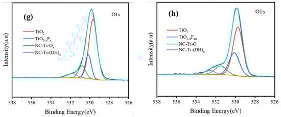 The XPS energy spectrum of O1s could be deconvoluted into three peaks corresponding to the O-C bond as well as the O-Ti bond, where the O-C bond was located at 530.7 eV of the XPS energy spectrum and the O-Ti bond in the anatase TiO2 grown in situ on Ti3CN after oxidation of the TiO2 was located at 529.8 eV of the XPS energy spectrum [24,30].