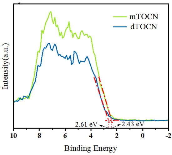 To analyze the energy band structure of the catalyst, the valence band potential (VB) was firstly obtained based on the XPS valence band spectroscopy test, as was shown in Figure 9 XPS valence band spectral curves of the samples dTOCN and mTOCN. The instrumental figure of merit was 4.3 eV, and the valence band potentials of dTOCN and mTOCN were obtained to be 2.4 and 2.29 eV relative to the standard hydrogen electrode, respectively.