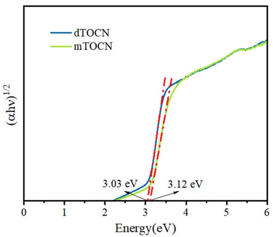 The light absorption properties of mTOCN and dTOCN were measured by UV-Vis diffuse reflectance spectroscopy (DRS). From Figure 10, it can be seen the absorption edge of mTOCN is at 325 nm and the absorption region is limited to 400 nm, while the absorption edge of dTOCN undergoes a slight red shift to 350 nm and the absorption region is limited to 410 nm. The Visible light absorption of both heterojunction samples is elevated to some extent at 325–400 nm and 350–410 nm, which indicates the successful configuration of the composite energy bands of the heterojunction samples, whose absorption range of light is expanded from the near-ultraviolet to a part of the Visible range.