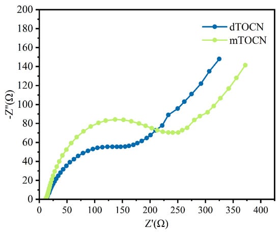 The Nyquist plot of different heterojunctions is shown in Figure 13. The semicircle diameter of the dTOCN curve is smaller than that of mTOCN, indicating the charge transfer resistance of heterojunction materials based on monolayer Ti3CN is lower than that of heterostructures based on multilayer Ti3CN, and the higher the conductivity of dTOCN is, the more favorable it is for the transport of photogenerated carriers in the catalyst.