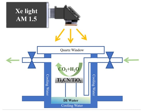 The photothermal catalyzed CO2 reduction test was carried out in a 400 mL homemade quartz glass reactor, as shown in Figure 15. Firstly, the height of the Xe light source from the catalyst surface and the current size were adjusted, and the light intensity on the catalyst surface was set to 600 mW/cm2, and the filter used was an AM1.5 filter (full solar spectrum light). The synthesized Ti3CN/TiO2 heterojunction sample was dispersed in anhydrous ethanol and then uniformly applied on the surface of the light-transmitting glassware, and then dried at 60 °C before placing in the custom-made transparent quartz glass reactor, and the temperature was maintained at 30 °C. The temperature inside the reactor was maintained at 30 °C by turning on the cooling water circulation pump. A mixture of CO2 and H2O was introduced into the customized transparent quartz glass reactor as the reactants by means of bubble inlet, and then both sides of the reactor were opened, and the vacuum pump was used to repeatedly evacuate and purge the reactor five times with high-purity CO2 gas through the gas-washing bottle containing deionized water, and then after a period of time, the reactor was filled with the mixture of CO2 and H2O. Then, both sides of the reactor and the rotary ports were closed, and the reactor was placed in an airtight condition. The reactor was closed at both sides to make it airtight. The gas in the transparent quartz glass reactor was extracted once with a sampling needle as a blank control group and then the light was turned on, after which the gas products on the surface of the glassware were extracted with a sampling needle every hour and passed into the gas chromatograph for detection, and the photothermal synergistic transformation of CO was carried out for a total of 4 h. The gas mixture was purged five times with ionized water, and then the reactor was filled with the mixture of CO2 and H2O after a period of time.
