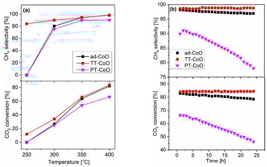 As can be seen in Figure 1a, the TT-CoO film is active at 250 °C with 84% selectivity toward methane, while both the ad-CoO and PT-CoO films were inactive at this temperature. As the temperature increases, the activity of all the tested catalysts appears, among which the ad-CoO and TT-CoO films achieve CH4 selectivity of approximately 98% after reaching a temperature of 400 °C. On the other hand, the PT-CoO film apparently exhibits poorer performance. At 400 °C, both CO2 conversion and CH4 selectivity are lower by about 17% and 8%, respectively, compared to the best TT-CoO catalytic film.