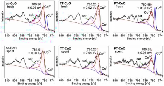 One more important result requires emphasizing, namely the comparison of the positions of the Co2+ band maximum for different films, when all the XPS spectra were normalized to the same value (284.6 eV) for the C 1s sp2 band. It is evident (Figure 2) that for the TT-CoO, both the fresh and spent films, this maximum is shifted towards a lower binding energy (780.2 eV) compared to the ad-CoO and PT-CoO (fresh and spent) films, for which the Co2+ band is approximately in the same position at 780.8–781.0 eV. Thus, the observed shift is about −0.7 eV.