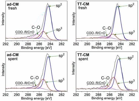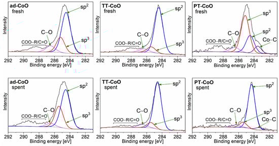 It should also be noted that the calcination process causes a significant increase in the sp2 carbon content in relation to sp3 carbon (ad-CoO fresh and TT-CoO fresh), which indicates the transformation of the carbon matrix into a more graphite-like structure. This was already noticed in our previous studies []. In turn, plasma treatment of the ad-CoO film (PT-CoO fresh) causes a sharp increase in the sp3 carbon content, which, apart from the previously mentioned preferential etching, is the result of the action of argon plasma on the carbon matrix []. After the catalytic process, these films reveal a huge increase in the carbon content (C/Co), including sp2 carbon (sp2/sp3 ratio increases), which, however, should not be associated with changes in the chemical structure of the film surface, but with the formation of the carbon deposit.
