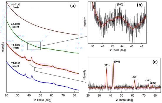 XRD patterns for (a) ad-CoO and TT-CoO films—raw data; (b) ad-CoO spent—analysis; (c) TT-CoO—analysis.