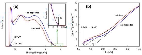 The same Kratos AXIS Ultra spectrometer, equipped with a helium lamp with a He I line (21.21 eV), was used for ultraviolet photoelectron spectroscopy (UPS). Valence band spectra, providing information about the electronic structure of the films, were collected from 55 µm diameter spots on the sample surface at 50 meV resolution. Data analysis was performed using Kratos Vision 2 software (ver. 2.2.10, Kratos Analytical Ltd., Manchester, UK, 2012). To complement this information about the band gap value, optical absorption measurements were conducted using a Shimadzu UV-1800 spectrophotometer (Shimadzu Corporation, Kyoto, Japan). Measurements were made in the transmission mode in the wavelength range of 200–800 nm with a 1 nm sampling interval.