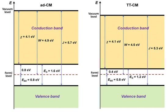 Using the determined elements of the electronic structure, band models for the ad-CM and TT-CM films were proposed and presented in Figure 7. While the electronic structure parameters of both films are similar and generally align with the values reported in the literature—such as the work function (from 4.55 to 4.85 eV, []) and the optical gap (from 1.09 to 2.09 eV, [])—there exists a notable distinction between them. This distinction is characterized by the transition from an intrinsic semiconductor for the ad-CM film to the n-type semiconductor for the TT-CM film, which is defined by the position of the Fermi level.