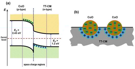 As a result of achieving thermodynamic equilibrium within the created heterojunction, marked by the alignment of the Fermi level, regions of negative and positive space charge are established on either side of the heterojunction, specifically in the p-type (CoO) and n-type (TT-CM) semiconductors, respectively. The dimensions of these space charge regions often span several dozen nanometers []. Consequently, when nano-sized entities interact within the heterojunction, these space charge regions might entirely fill them (Figure 8b), thereby altering their electronic characteristics. This transformation subsequently modifies the nature of the active catalytic centers on their surfaces, thereby influencing the catalytic properties.