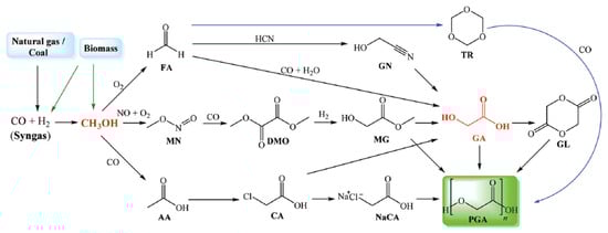 Beyond global warming concerns related to energy use and direct CO2 emissions, other significant environmental problems are caused by non-biodegradable plastic waste. It is well known to impact ecosystems but may also indirectly lead to the emission of greenhouse gases (e.g., from landfilling and incineration) [14,15,16]. This kind of waste mostly consists of common synthetic polymers like polyolefins (polyethylene, polypropylene), polyethylene terephthalate (PET), and nylon, as well as their combinations and composites. In this scenario, one sustainable alternative is to invest in the production of biodegradable polymers like polyglycolic acid (PGA), whose monomer (glycolic acid) can be produced from renewable feedstocks (Figure 1), showing reduced lifetime (i.e., better biodegradability) when compared to other sustainable polymers (e.g., polycaprolactone and polybutylene adipate-co-terephthalate) [15].