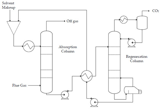 Figure 4. Typical flowsheet of CO2 chemical absorption by amine-based solvent. Adapted from [32].