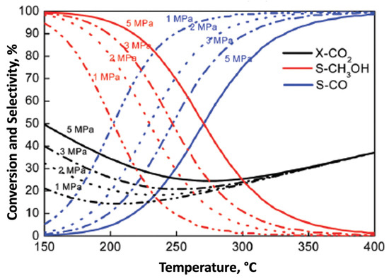 Figure 6. Chemical equilibrium of CO2 hydrogenation to methanol at different temperatures and pressures (stoichiometric feed H2:CO2 3:1): CO2 conversion, selectivity to methanol, and selectivity to CO. Reprinted with permission from [46].