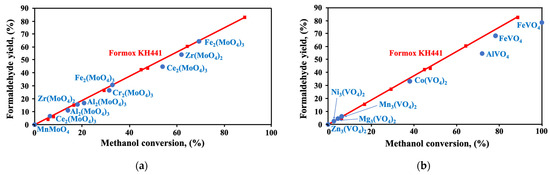 Beyond iron molybdate and silver, other active species have been tested. For instance, good catalytic activity was also unveiled with the use of alloys Zr(MoO4)3 and Ce2(MoO4)3. Performance comparison with the standard FORMOX formulation is shown in Figure 9a, where formaldehyde yield is presented as a function of methanol conversion [96]. Similarly, interesting catalytic properties in using vanadium associated to different elements were also shown in the literature, as shown in Figure 9b [96], where FeVO4 and AlVO4 catalysts were evidenced as capable of reaching 76–87% of selectivity to formaldehyde when methanol conversion is above 50% (on the other hand, other metal catalysts associated with vanadium show a more or less low catalytic activity for oxidation).