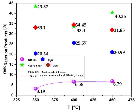 Figure 1 illustrates the yields of different reaction products, namely liquids, solids, H2O, and gas, obtained from the pyrolysis of activated açaí seeds in a laboratory-scale borosilicate glass reactor. The pyrolysis was conducted at temperatures of 350, 400, and 450 °C, pressure of 1.0 atm, and the açaí seeds were activated using a 2.0 M KOH solution. The results demonstrate that the yield of bio-oil increases gradually as the temperature rises, and this trend was well-fitted with a first-order exponential decay model, yielding an r2 value of 1.00. These findings align with the observations made by Serrão et al. [], who investigated the pyrolysis of açaí seeds in a natural environment at temperatures of 350, 400, and 450 °C and 1.0 atm on a pilot scale. Their study also reported an increase in bio-oil yield with temperature. Similar studies focusing on biomass pyrolysis have consistently reported an increase in bio-oil yield within the temperature range of 200 to 450 °C [,,,,,,,,,,,].