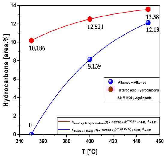Figure 2 and Figure 3 provide visual representations of the impact of process temperature on the composition of bio-oil derived from the pyrolysis of activated açaí seeds (Euterpe oleracea, Mart). The açaí seeds were chemically activated using a 2.0 M KOH solution, and the pyrolysis experiments were conducted at temperatures of 350, 400, and 450 °C, under a pressure of 1.0 atm, and at laboratory scale. The chemical composition of the liquid fraction of bio-oil was categorized into two main groups: hydrocarbons and oxygenates. Hydrocarbons encompass acyclic saturated/unsaturated hydrocarbons (alkanes + alkenes) as well as heterocyclic hydrocarbons (cycloalkanes + cycloalkenes + aromatics). On the other hand, oxygenates consist of phenols, ketones, and esters. This categorization allows for an assessment of the suitability of the designed process in producing chemical compounds that can serve as effective fuels. It is worth noting that oxygenates, due to their acidic nature, often do not burn efficiently, leading to the accumulation of residues in engines []. Therefore, the distinction between hydrocarbons and oxygenates serves as a valuable means of evaluating and comparing different thermochemical conversion processes for their potential fuel applications.